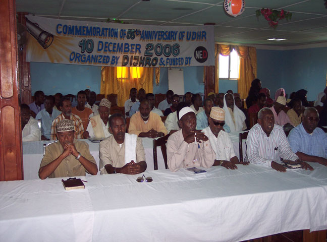 Axad, December 10, 2006(HOL): Xarunta Dr. Ismaaciil Jimcaale ee Xuquuqda Aadanaha ayaa maanta Muqdisho uga dabaaldegtay sanadguuradii 58aad ee ka soo wareegatay markii la soo saaray Baaqa Caalamiga ah ee Xuquuqda Aadanaha oo ku beegneyd 10-kii December 1948-kii, xiligaasoo laga soo gudbay dagaalkii labaad ee Adduunyada.
