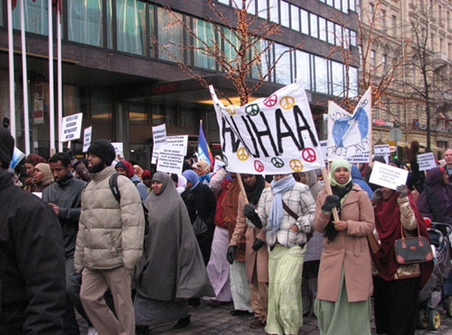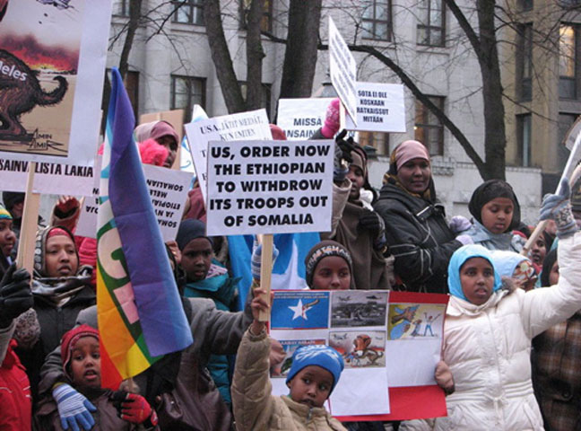 Sabti, January 13, 2007(HOL): Bannaabax ballaaran oo looga soo horjeeday joogitaanka ciidamada Itoobiya ee dalka Soomaaliya iyo weerarada gardarada ah ee ay ciidamada mareykanka iyo kuwa Itoobiya ku hayaan koofurta Soomaaliya ayaa maalintii jimcaha aheyd ee12. Jan 2007 ka dhacay magaalada Helsinki ee dalka Finland. Bannaabaxaas oo ay kasoo qeyb qaleen dadweyne aad u fara badan oo isugu jiray haweenka, culimada, aqoonyahannada, waxgaradka, cuqaasha, dhalinyarada iyo carruurta soomaaliyeed ee ku nool wadanka Finland kuwaasoo ka kala yimid gobolada dalka.