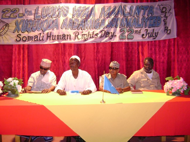 Axad, July 22, 2007(HOL): Xaflad lagu xusayo maalinta xuquuqda Aadamiga Soomaaliyeed, aas-aaskii Xarunta Dr. Ismaaciil Jimcaale ee Xuquuqda Aadanaha iyo 17 guuradii ka soo wareegtay geeridii garyaqaan/halyeey Dr. Ismaaciil Jimcaale Cosoble ayaa shalay lagu qabtay Hotelka Ambassador ee magaalada Muqdisho, waxaana xuska munaasabadahaas isu tegay ka soo qeybgalay mas'uuliyiin aad u badan oo ay ka mid yihiin kuwa Ururrada Bulshada Rayidka, Mas'uuliyiinta Gobolka Banaadir, Suxufiyiin iyo marti sharaf kale.