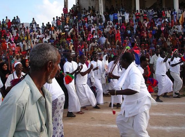 Inta badan dadkii ka soo qeyb galay isu soo baxa lagu taageeray shirweynaha dib u heshiisiinta Qaran waxay siteen funaanado ay ku xardhan tahay calaamada guddiga shirweynaha, waxaana Garoonka lagu soo bandhigay ciyaaraha hidaha iyo dhaqanka oo qaarkood ay ka qeyb qaateen madaxda sare ee gobolka Banaadir oo uu horkacayo guddoomiyaha ahna duqa magaalada Muqdisho Maxamed Cumar Xabeeb (Maxamed Dheere).