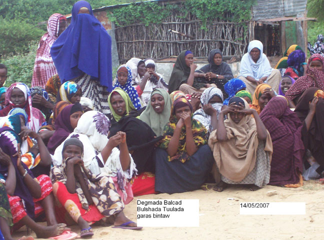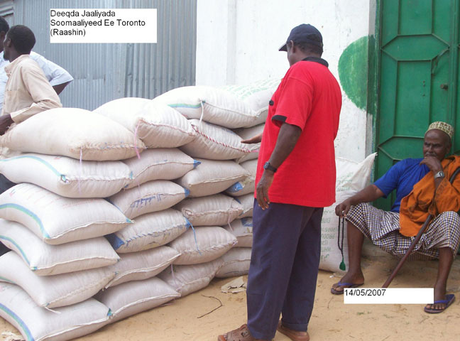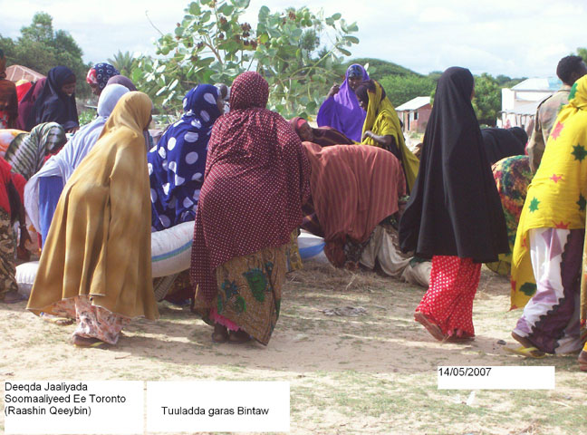 Khamiis, May 17, 2007(HOL): Ururka Samafalka Wadaniga ah ee Bani’aadam ayaa Deeq raashin ah waxaa uu guddoonsiiyay Dad ka barakacay Magaalada Muqdisho oo ku sugan Tuulooyin hoos yimaada Gobolka Shabeelaha Dhexe.