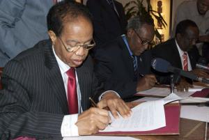 | Madaxda sare ee Dowladda oo saxiixaya Heshiiskii ay gaareen |