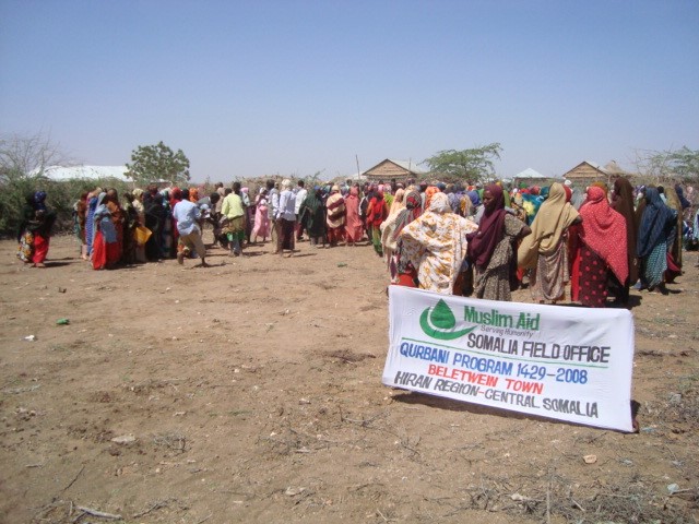 Talaado, December 09, 2008(HOL): Munaasabadda Ciidda Awgeed ayay Hay'adda Muslim Aid ee ka howl-gasha Magaalada Beledweyne waxaa ay u qeybisay dadka soo barakacay ee ku jira Xeryaha Magaalada Beledweyne ilaa 100 Neef oo Ari ah si markaa farxadda maalinta Ciidda ay ula qeysadaan dadka kale ee wax heysta.