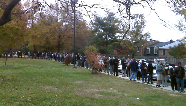 Waxaan codkaygii saaka ka dhiibtay iskuul ku yaalla Alexandria, Virginia. Aniga oo is lahaa cidi kaama horayso ayaan waxa aan iskuulkii tegay 6:30am (6dii iyio badhkii subaxnimo). Markii aan iskuulkii gaadhay waxa iga yaabiyey dadka tirada badan ee safka dheer ku jira. Doorashadu waxa ay bilaabanaysay 7da subaxnimo. Aniga oo yaaban ayaan nin shaqaalihii doorashada ka mid ahaa weydiiyey goorta waxan oo dad ahi ay yimaadeen. Waxa uu ii sheegay in uu 3:00am (saddexdii habeenimo) yimi oo uu la kulmay dad mar horeba safka sii galay.