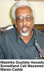 Axad, 05 October 2008 (HOL): Wasiirka Duulista Hawada Somaliland Cali Maxamed Waran-Cadde ayaa sheegay in Baasaboorkii hore ee Cagaarka ahaa ee Somalia lagaga dhoofayo Madaarada Somaliland sanadkan, isla markaana aanay Xukuumad ahaan aqoonsanayn Baasaboorka cusub ee dhawaan ay hirgelisay Dawladda Federaalka ee Soomaalia. Wuxuuna ugu baaqay dhammaan umadda Soomaaliyeed inay madaarada Somaliland kaga dhoofi karaan gudashada Xajka ee sanadkan Baasaboorkii hore ee Cagaarka ahaa.