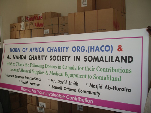 Madaxa Hay’adda Horn of Africa Charity Organization (HACO) Sh. Maxamed Cali Geeddi oo ka hadlay Munaasibaddii wareejinta Agabkan iyo Dawooyinkan, ayaa caawimadan ku tilmaamay mid wax wayn ka tari doonta baahiyaha Caafimaad, waxaanu u mahad-naqay cid kasta oo gacan ka geysatay hirgelinta caawimadan oo ay ugu horreeyaan Hay’adda Human Concern International iyo Ururka Soomaalida Ottowa ee Somali Ottowa Community. “Waxaan u mahad-naqayaa dadkii soo qaban-qaabiyay in laynagu soo caawiyo Qalabkan Cusbatallada iyo Dawooyin, kuwaas oo qiimahoodu gaadhayo $250,000 oo Dollar-ka Maraykanka ah. Dadka qaarkood Qalabka iyo Dawooyinka ayay qayb ku lahaayeen, dadka qaarkoodna abaabulka iyo habaynta ayay lahaayeen, dhammaantoodna dadkii ka qayb galay hawshan waxaanu Ilaahay uga baryaynaa inuu ka abaal-mariyo. Hase ahaatee, waxa dadka aanu sida gaarka ah ugu mahadnaqayno ka mid ah Hay’adda Human Concern International oo badankoodu Reer Canada ay yihiin, isla markaana ah Hay’ad Islaami ah oo Canada deggan, waxaana shaqada ugu badan soo qabtay Nin lagu magacaabo Mr. Garnayl. Waxa kale oo isna jira Nin lagu magacaabo David Smith oo reer Canada ah, kaas oo ah ninka Qalabka badankiisa soo ururiyay. Sidoo kale waxaanu u mahadnaqaynaa Masjidka wayn ee Abu-Hurayra oo ah Xarunta Islaami ah oo ku taala Toronto oo isna ka qayb qaatay iyo sidoo kale Ururka Somali Ottowa Community oo iyana qayb ka ahaa caawimadan. Dhinaca kale waxa iyana in loo mahadnaqo mudan Health Partners oo ku deeqay Dawooyinka. Waxa kale oo jira dad ku sugan Dubai oo iyana qayb ka ahaa isku soo dubba-ridka caawimadan.” Ayuu yidhi Maxamed Cali Geedi.