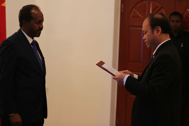 Sii hayaha xilka wasiirka arrimaha dibadda Soomaaliya, C/raxmaan Ducaale Beyle ayaa sheegay in maanta madaxweynaha Soomaaliya uu ka guddoomay warqadaha aqoonsiga danjiraha cusub ee Shiinaha ay u soo magacowday dalka, warsame Geel-jire, isagoo sheegay in ay ka wada-hadleen madaxweynaha iyo safiirka sidii loo billaabi lahaa mashaariic horumarineed oo dowladaha Shiinaha ay ka fuliso Soomaaliya.