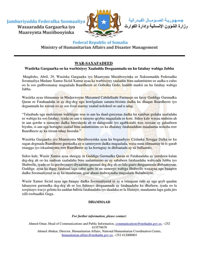 Khamiis, Abril 30, 2020 (HOL) - Wasaaradda gargaarka iyo maaraynta musiibooyinka Soomaaliya ayaa ka hadashay xaalada gobolka Gedo, halkaas oo uu fatahaad ka sameeyay webiga Jubba.