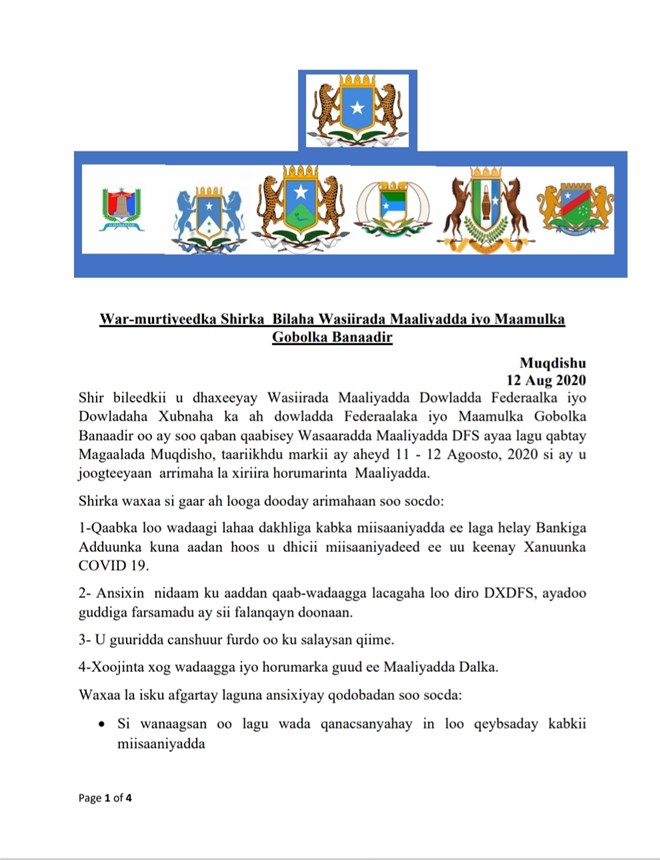 Arbaco, Agoosto 12, 2020 (HOL) - Wasaaradda Maaliyadda ee Xukuumadda Federaalka Soomaaliya, Wasaaradaha Maaliyadda ee Dowlad-gobolleedyada dalka iyo gobolka Banaadir oo labo maalin uu shir uga socday Muqdisho ayaa la soo gabagabeeyay, iyadoo laga soo saaray warmurtiyeed.