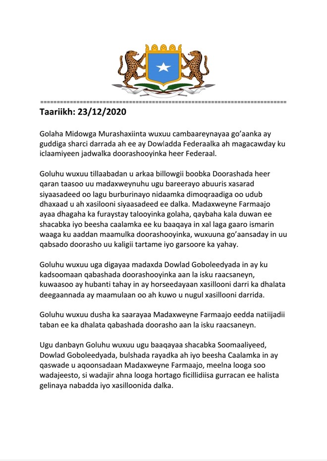Arbaco, December, 23, 2020 (HOL) - Midowga musharixiinta dalka ayaa si carro leh uga jawaabay jadwalka doorasho ee ka soo baxay  Guddiga doorashooyinka dalka ee aan wali leysku raacsaneyn.