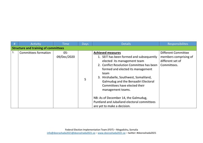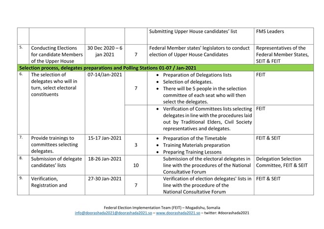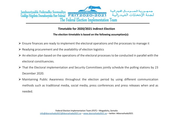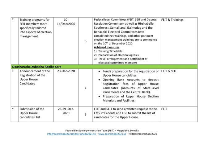 Sabti, December, 26, 2020 (HOL) - Guddiga Doorashooyinka heer Federaal ayaa shaaciyay jadwalka doorashada dalka dalka ee sanadka 2020-21, gaar ahaan doorashada Aqalka Sare iyo Golaha Shacabka Baarlamaanka Soomaaliya.