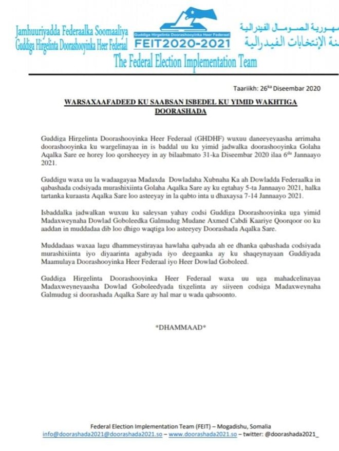 Talaado, December, 29, 2020 (HOL) - Guddiga Doorashooyinka dad ban ee Heer Federaal ayaa shaaciyay isbaddal uu ku yimid jadwalka doorashada Aqalka Sare ee horey loo qorsheeyey in ay bilaabmato 31ka Diseembar ilaa 6da Jannaayo 2021.