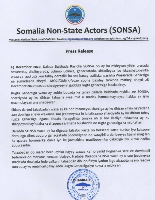 Talaado, December, 29, 2020 (HOL) - Dallada bulshada rayidka ah ee Soomaaliya (SONSA), ayaa sheegtay in ay aad uga xun tahay go’aankii wasaaradda ganacsiga Soomaaliya ay ku kala diray rugta ganacsiga iyo warshadaha Soomaaliya.