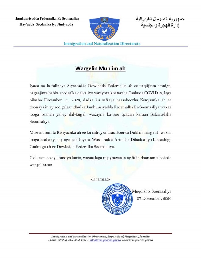 Isniin, December, 07. 2020 (HOL) - War ka soo baxay hay'adda Socdaalka iyo Jinsiyadaha Dowladda Soomaaliya ayaa lagu sheegay in dhamaanba muwaadiniinta Kenyan -ka ah ee imanaya Soomaaliya marka hore Dal ku gal ah ka soo qaataan safaaradda Soomaaliya ee Nairobi.