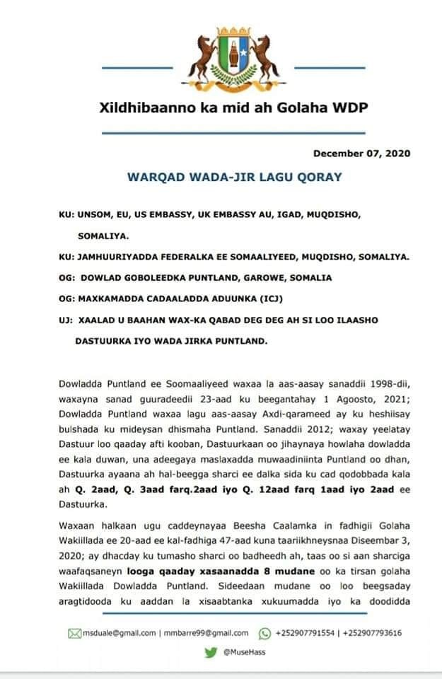 Talaado, December, 08, 2020 (HOL) -8 xildhibaan oo katirsanaa barlamaanka dowlad goboleedka Puntland, kuwaas oo dhawaan xasaanadii laga xayuubiyay ayaa dowladda federalka Soomaaliya iyo beesha caalamka u gudbiyay dacwad ka dhan ah madaxweyne Deni.