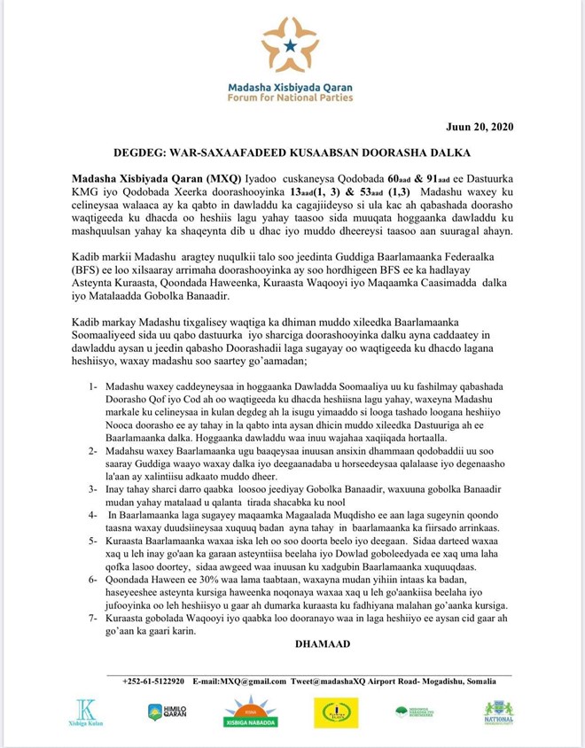 Sabti, Juun 20, 2020 (HOL) - War saxaafadeed kasoo baxay madasha axsaabta qaran oo ay ku midoobeen dhowr xisbi oo mucaarad ah ayaa waxaa si weyn loogu dhaliilay dowladda uu hoggaamiyo madaxweyne Maxamed Cabdullaahi Farmaajo, waxaaba lagu xusay warkaas qoraalka ah in dowladda hadda jirta ay ku fashilantay qabashada doorasho qof iyo cod ah .