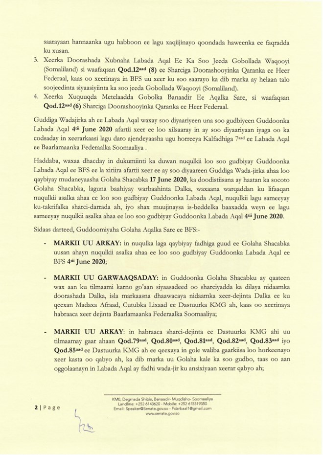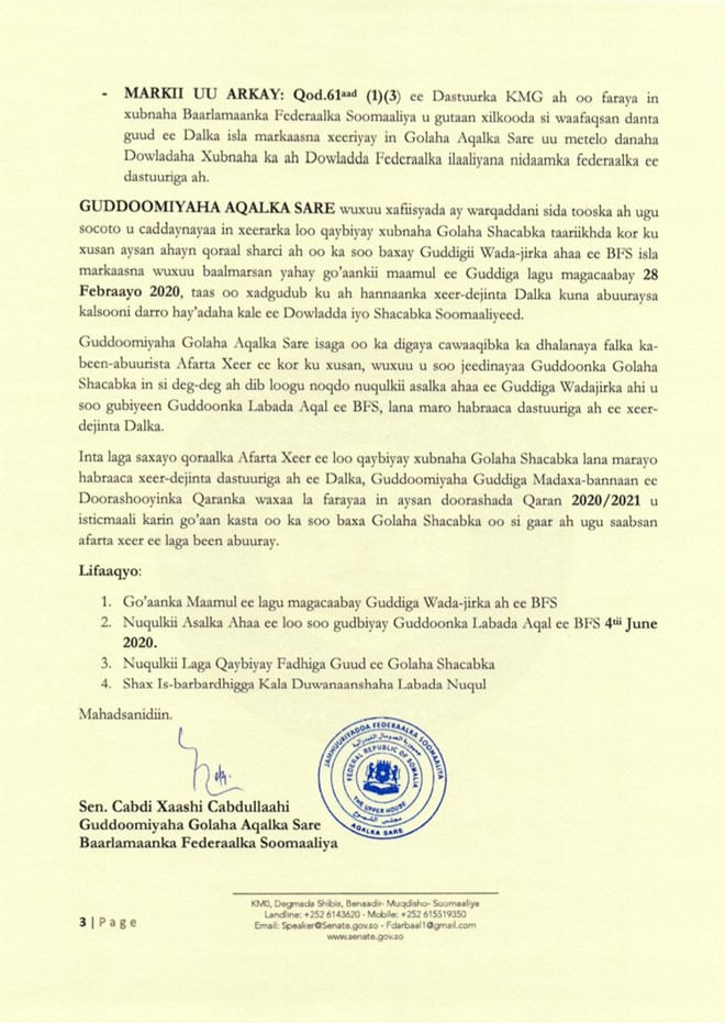 Guddoomiyaha aqalka sare ayaa faray guddoomiyaha guddiga doorashooyinka in aysan doorashada qaran u isticmaali Karin go’aan kasta oo kasoo baxa barlamaanka aqalka hoose oo si gaar ah ugu saabsan xeerarka hadda laga doodayo.