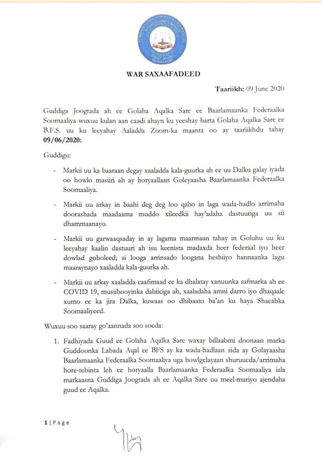 Talaado, Juun 09, 2020 (HOL) - Barlamaanka aqalka sare ee Soomaaliya ayaa ku baaqay in 25 june dowladda federalka iyo dowladdaha xubnaha ka ah iskugu yimaada wada tashi degdeg ah oo looga arinsanayo doorashooyinka qaran ee soo socoda.