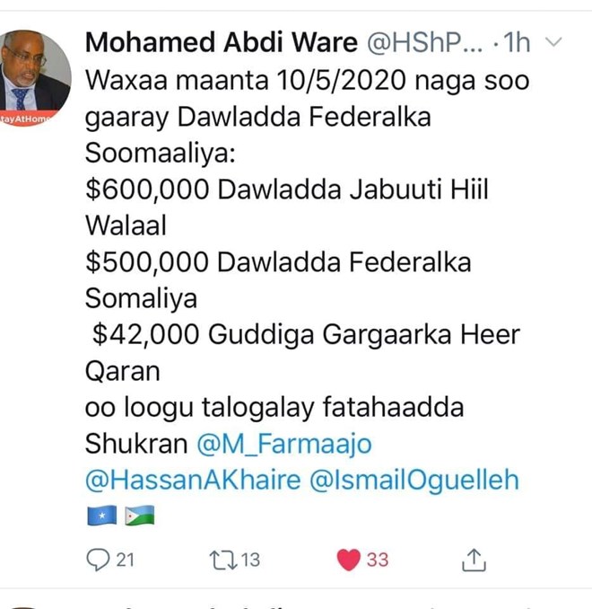 newsinsideMadaxweynaha ayaa sheegay inaay heleen lacag gaareeysa $1,142000 (Hal milyan, boqol afartan iyo laba kun oo doolar)  oo ka soo gaartay dowlada Soomaaliya, wuxuuna sheegay in lacagtaas $600,000 oo ka timid dalka Jabuuti, $500,000 aay ka timid dowlada federaalka, halka $42,000 ay ka soo gaartay gaartay Gudiga Gargaarka Qaranka. Sida uu Madaxweyne Waare  ku sheegay bogiisa Twitterka.