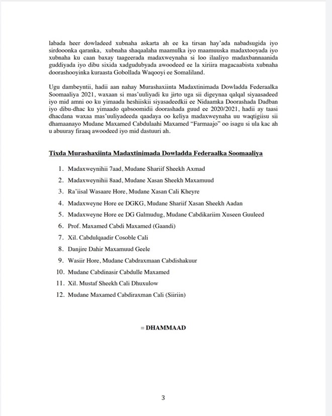 ‘’Waxaan ku baaqeynaa in si deg deg ah guddiyada looga dhax saaro xubnaha Askarta ah ee ka tirsan hay’adda nabad-sugida Qaranka, xubnaha shaqaalaha dowladda iyo waliba kuwa ku caanbaxay taageerrada madaxweyne Farmaajo’’ ayaa lagu yiri qoraalka