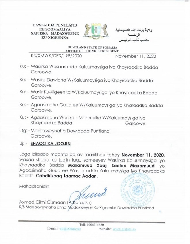 Khamiis, November, 12, 2020 (HOL) - Madaxweyne ku xigeenka Puntland Axmed Karaash ayaa shaqadii ka joojiyay wasiirkii kalluumaysiga Puntland Maxamuud Xaaji Saalax iyo agaasimihii guud ee wasaaraddaas, Cabdirisaaq jaamac Aadan.