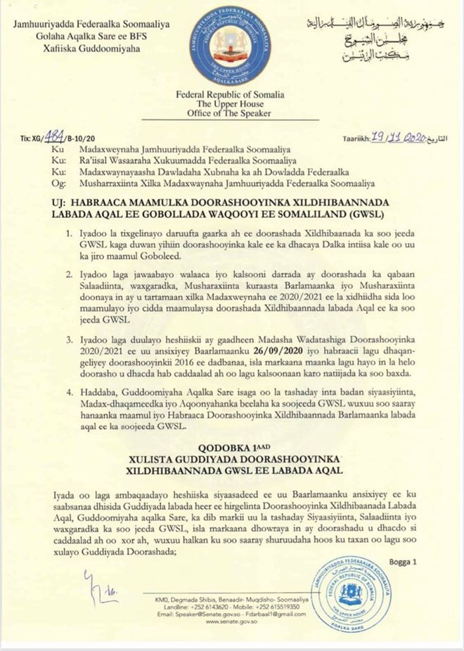 Khamiis, November, 19, 2020 (HOL) - Guddoomiyaha Aqalka sare ee Soomaaliya ayaa soo saaray Habraaca lagu maamulayo doorashada Xildhibaanada labada gole ee ka soo jeeda gobolada Waqooyi (Somaliland).