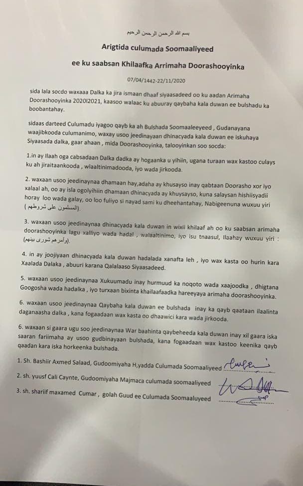 Isniin, November, 23, 2020 (HOL) - Hay'adda Culimada Soomaaliya ayaa qoraal ay soo saartay waxaa ay uga hadashay khilaafka siyaasadeed iyo muranka ka taaggan doorashada lagu waddo dhawaan in ay dalka ka dhacdo oo ay isku maandhaafsan yihiin siyaasiyiinta mucaaradka iyo mas'uuliyiinta dowladda dhexe ee Federaalka.