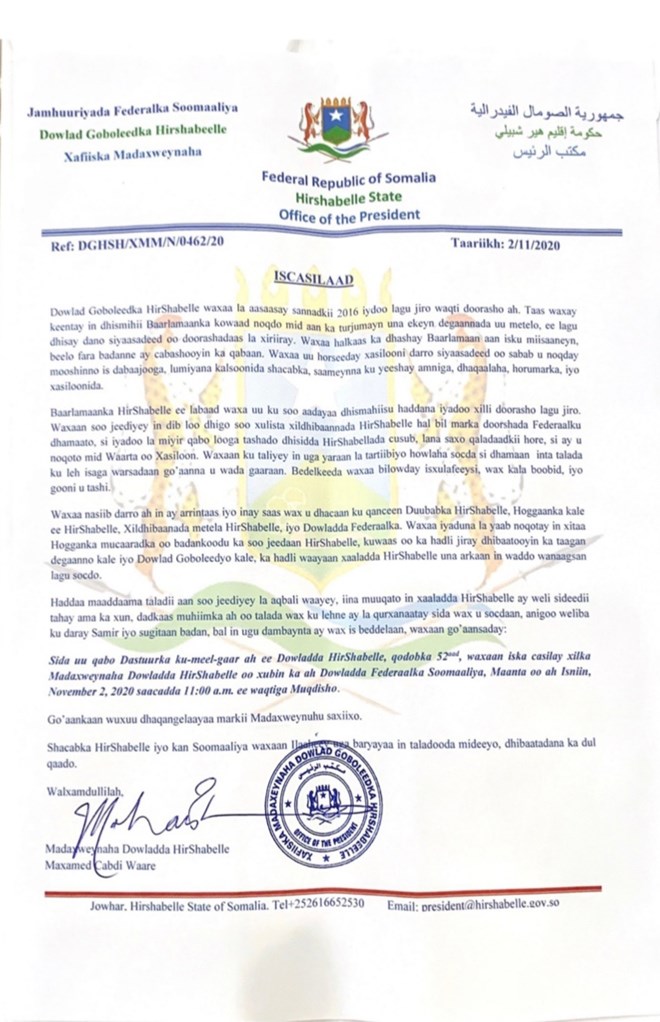 Talaado, November, 03, 2020 (HOL) -Madaxweynihii Dowlad Gobolleedka Hirshabeelle Maxamed Cabdi Waare ayaa bartiisa Twitter -ka ku shaaciyay in uu iska casilay xilkii madaxweynaha, isaga oo sheegay in uu u maray qaab sharciga waafaqsan.