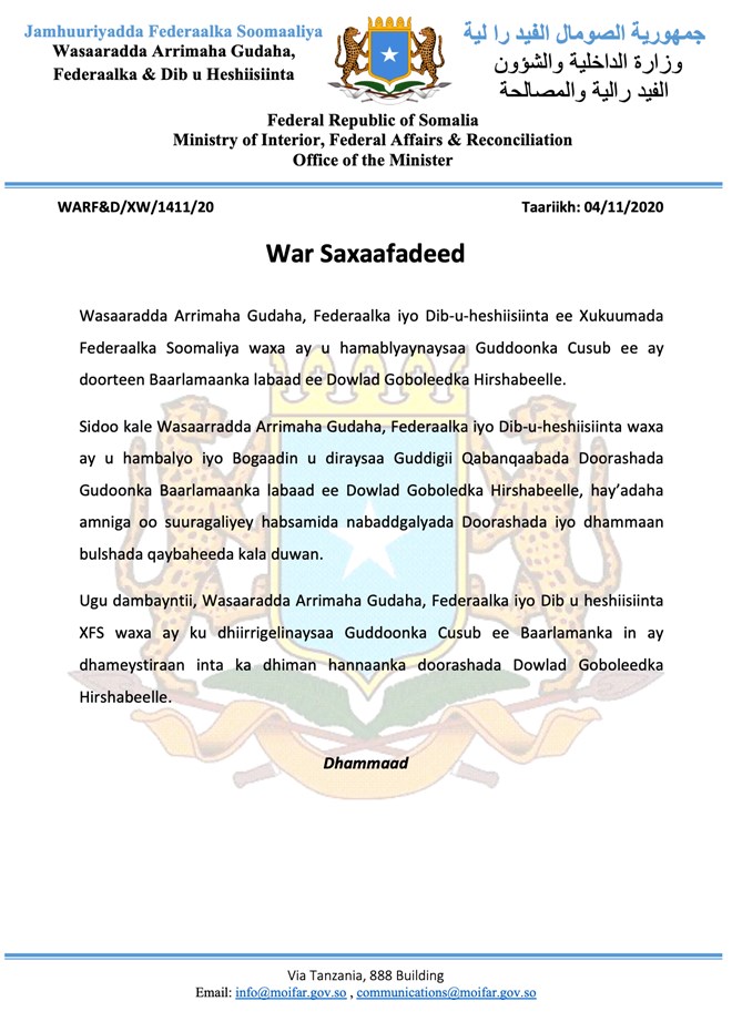 Arbaco, November, 04, 2020 (HOL) -War Qoraal ah oo ka soo baxay Wasaarrada Arrimaha Gudaha iyo Federaalka Soomaaliya ayaa lagu hambalyeeyay Guddoonka cusub ee Dowlad Gobolleedka Hirshabeelle oo maanta lagu doortay magaalada Jowhar.