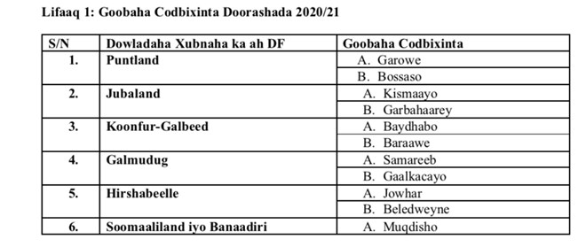 Khamiis, October 1, 2020 (HOL) - Jadwalka doorashada ka dhacaysa dalka 2020/2021 ayaa rasmi ah loo soo saaray, ka dib markii hannaanka ay doorashada ku dhacayso ay ka heshiiyeen Dowladda Federaalka, dowlad-gobolleedyada iyo Gobolka Banaadir.