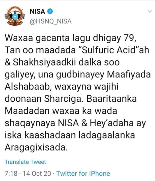Arbaco, October 14, 2020 (HOL) -Hay’adda nabad sugida iyo sirdoonka Soomaaliya ee NISA, ayaa sheegtay in ay gacan ku dhigtay 79, Tan oo maadada “Sulfuric Acid” oo ah maadooyinka qaraxyada laga sameeyo & Shakhsiyaadkii dalka soo galiyey, una gudbinayey ururka Al-shabaab.