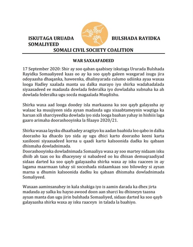 Khamiis, September 17, 2020 (HOL) - Shir ay soo qaban qaabisey iskutaga Ururada Bulshada Rayidka Somaaliyeed, ayaa waxaa looga Hadlay xaalada maanta uu dalka marayo iyo shirka wadahadalada siyaasadeed ee madaxda dowlada federalka iyo dowladdaha xubnaha ka ah dowlada federalka ugu socda Muqdisho.