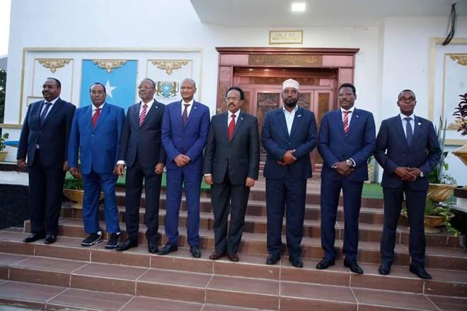 Khamiis, September 17, 2020 (HOL) - Shir ay yeesheen Madaxda Dowlada Federaalka ah iyo Dowladaha Xubnaha ka ah oo uu shir guddoominayey Madaxweynaha Jamhuuriyadda Federaalka Soomaaliya Mudane Maxamed Cabdullaahi Farmaajo, ayna ka qayb-galeen Ku-simaha Raysul Wasaaraha Mudane Mahdi Maxamed Guuleed, Madaxweynaha Dowlada Puntland Mudane Saciid Cabdullaahi Deni, Madaxweynaha Jubbaland Mudane Axmed Maxamed Islaam, Madaxweynaha Koonfur Galbeed Mudane Cabdicasiis Xasan Maxamed, Madaxweynaha Galmudug Mudane Axmed Cabdi Kaariye, Madaxweynaha Hirshabelle Mudane Maxamed Cabdi Waare iyo Guddoomiyaha Gobolka Banaadir ahna Duqa Muqdisho Mudane Cumar Maxamuud Maxamed. Shirkaas wuxuu ka dhacay magaalada Mugdisho intii u dhaxaysay 13 -17 Sebteember 2020.