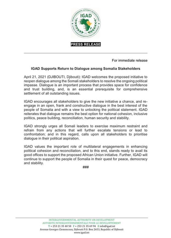 Arbaco, April, 21, 2021 (HOL) - Urur goboleedka IGAD ayaa soo dhoweeyay hindisaha la soo jeediyey ee ah in dib loo furo wadahadalka ka dhexeeya saamilayda siyaasada Soomaaliya, si loo xaliyo ismari waaga.