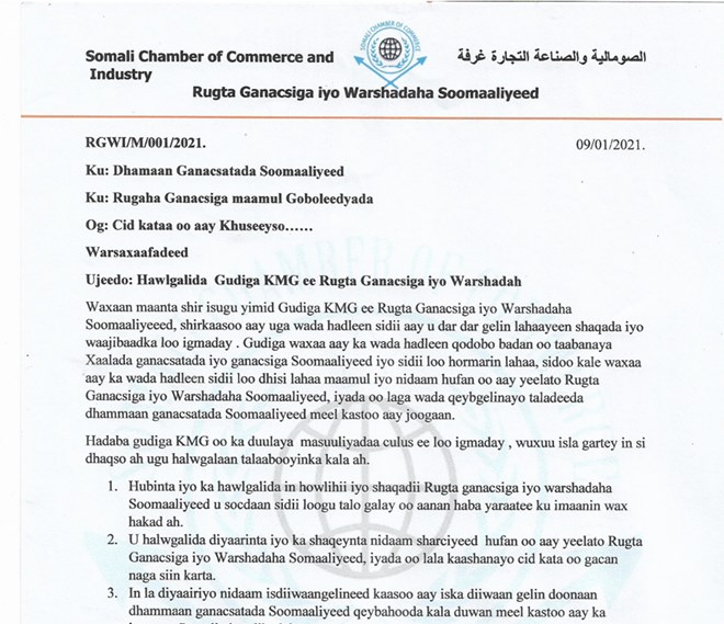 Wasiirka Ganacsiga ayaa kala diray guddiggii Rungta Ganacsiga iyo Warshadaha Soomaliyeed oo dhinacooda ku gacan-seyray go'aanka Wasiirka, hasse ahaatee qoraal ka soo baxay guddigan cusub ee KMG ayaa lagu sheegay in ay dardar-galinayaan howlaha culus ee hor yaala ee loo idmaday.