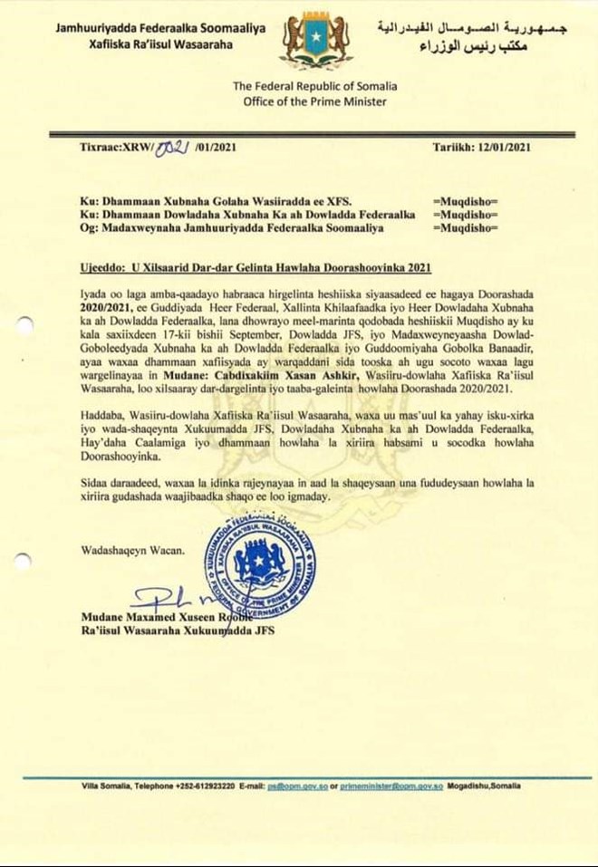 Talaado, Janaayo, 13 2021 (HOL) - Qoraal ka soo baxay xafiiska Ra'iisal Wasaaraha Xukuumadda Soomaaliya Maxamed Xusseen Rooble ayaa u magacaabay Wasiiru-dowlaha Xafiiskiisa Cabdixakiin Xassan Ashkir howlaha doorashada.