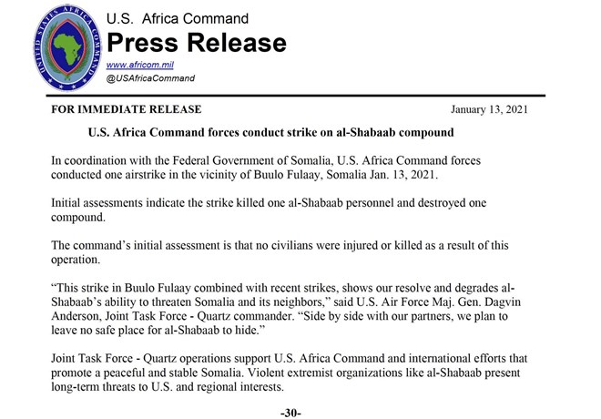 Khamiis, Janaayo,, 14, 2021 (HOL) -War ka soo baxay Taliska ciidanka Mareykanka ee AFRICOM ayaa lagu sheegay in howlgal ay ka kaashadeen iyaga iyo ciidanka dowladda Soomaaliya ka fuliyeen gobolka Baay gaar ahaan deegaan lagu magacaabo Buula Fuulaay.