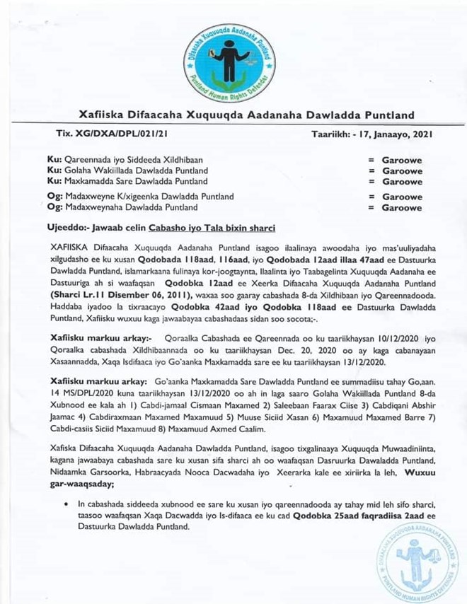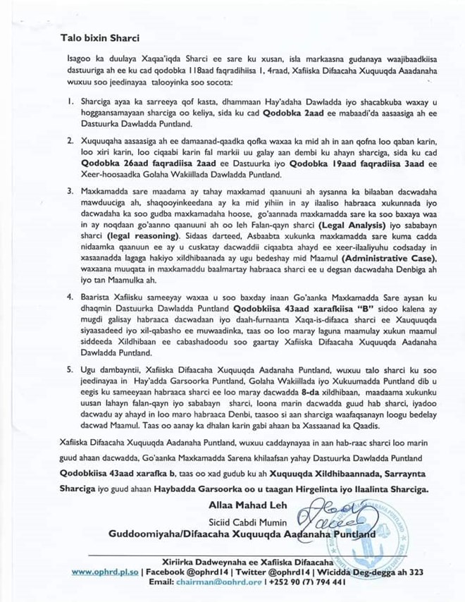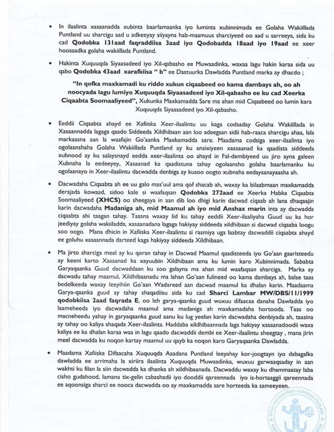 newsinsideXafiiska difaacaha oo arrintan qoraal dheer kasoo saaray ayaa talo sharci kusoo jeediyay in golaha garsoorka iyo golaha xukuumada Puntland dib u eegis ku sameeyaan habraacii sharci ee loo maray dacwada siddeeda xidlhibaan.