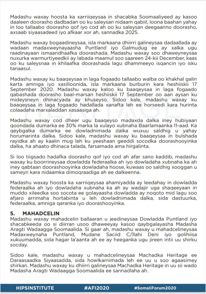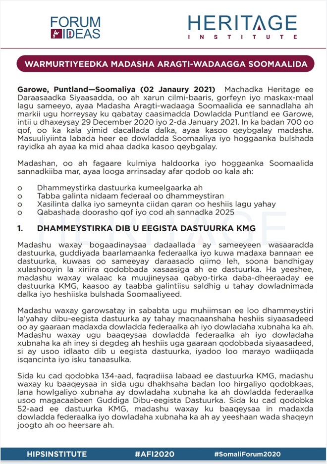 Sabti Janaayo, 02, 2021 (HOL) - War-Murtiyeedkii ayaa lagasoo saaray Madasha Aragti wadaagga Soomaalida ee Heritage, kaas oo ay ka qayb galeen Madaxda Dowladda Federaalka, Madaxda Dowlad Goboleedyada, Qaar ka mid ah xubno la tirsan Midowga Musharraxiinta Madaxweynayaasha Soomaaliya, Xildhibaano, Siyaasiyiin hore iyo qaybaha kala duwan ee bulshada.