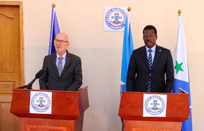Axad, Janaayo, 24 2021 (HOL) - Madaxweynaha Galmudug Axmed Cabdi Kaariye Qoorqoor ayaa maanta xafiiskiisa ku qaabilay wafdi uu hoggaaminayo Ergeyga gaarka ah ee Qaramada Midoobay Mudane James Swan