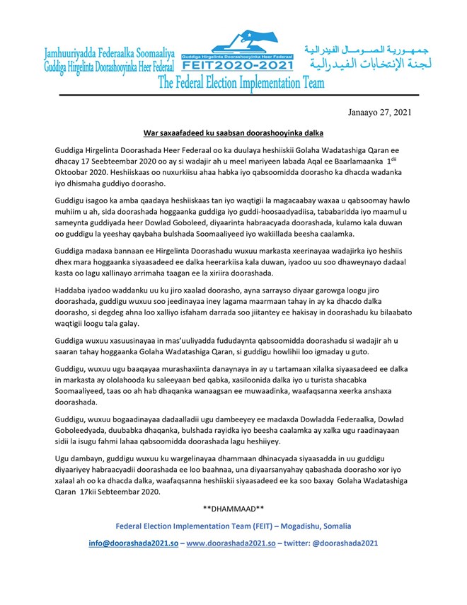 Arbaco, Janaayo, 27, 2021 (HOL) - Iyadoo wali aan laga heshiin khilaafka ka taaggan qabsoomida doorashada heer federaal ayaa warbixin arintan ku saabsan waxaa soo saaray guddiga her galinta doorashooyinka heer federaal.
