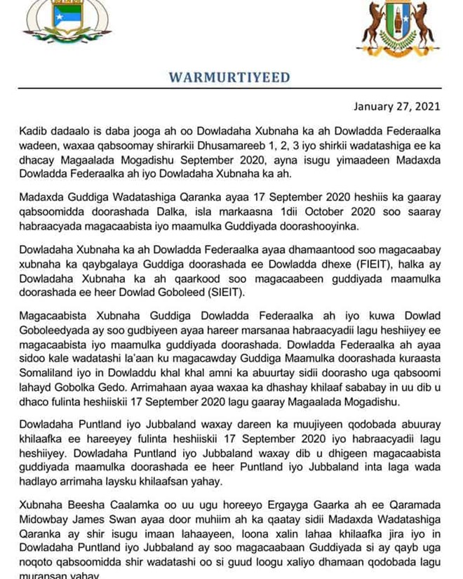 Khamiis, Janaayo, 28, 2021 (HOL) - War-saxaafadeed ay wada jir u soo saareen madaxweyne dowlad gobolleed Puntland iyo Jubaland ayeey ku dalbadeen shir deg deg ah looga hadlayo khilaafka ka taagan wali qabsoomida doorashada heer Federaal ee dalka.