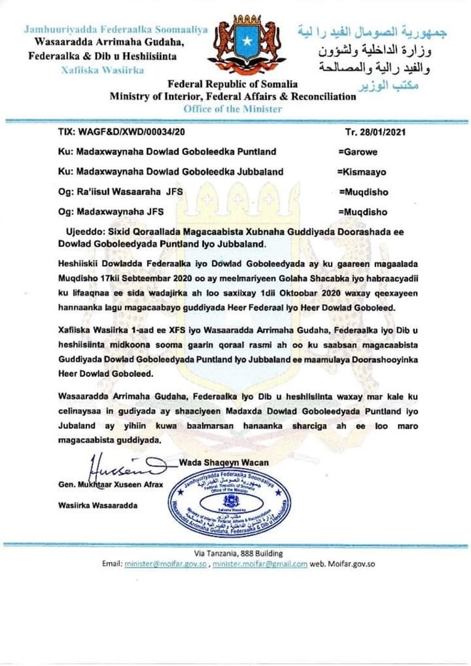 Khamiis, Janaayo, 28, 2021 (HOL) - War qoraal ah oo ka soo baxay Wasaarradda Arrimaha Gudaha, Federaalka iyo Dib-u-heshiisiinta ayaa looga hadlay guddiyada doorasho ee heer Federaal oo ay ku dhawaaqeen labada dowlad gobolleed Puntland iyo Jubbaland.