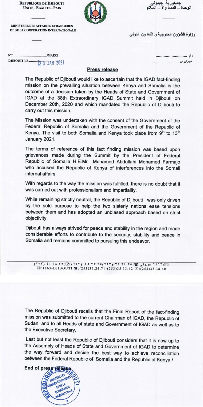 Khamiis, Janaayo, 28, 2021 (HOL) - Qoraal ka soo baxay Wasaarradda Arrimaha dibadda Jamhuuriyada Jabuuti ayaa looga hadlay go'aankii ka soo baxay guddigii xaqiiqo raadinta Urur gobolleedka IGAD uu u saaray muranka dhinaca xudduuda ah ee u dhaxeeya dowladdaha Soomaaliya iyo Kenya.