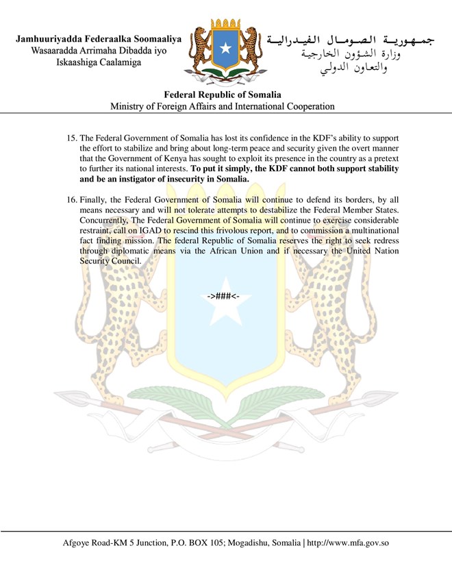 ''Dowladda Soomaaliya waxey lumisay kalsoonidii ay ku qabtay in ciidanka Kenya qeyb ka yihiin dadaalada la doonayo in dib loogu soo celiyo nabadda iyo deggenaashaha Soomaaliya' ayuu lagu yiri qoraalka ka soo baxay Wasaarradda Arrimaha dibadda Soomaaliya.