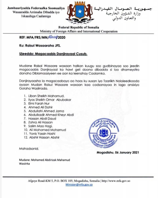 Warqada Wasaarrada Arrimaha Dibada iyo Magacyada Xubnaha Safiirradda ah ee ansixintooda laga horyimid.
