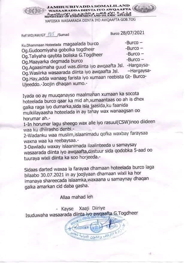 newsinside"Waxa la farayaa hoteelada Burco laga bilaabo 30, 7, 2021 in ay joojiyaan dhamaan wixii ka hor imanaya shareecada Islaamka, waxana nu samaynay dhaqangalka amarkan cid daba gasha" ayaa lagu yidhi warsaxaafadeedka.