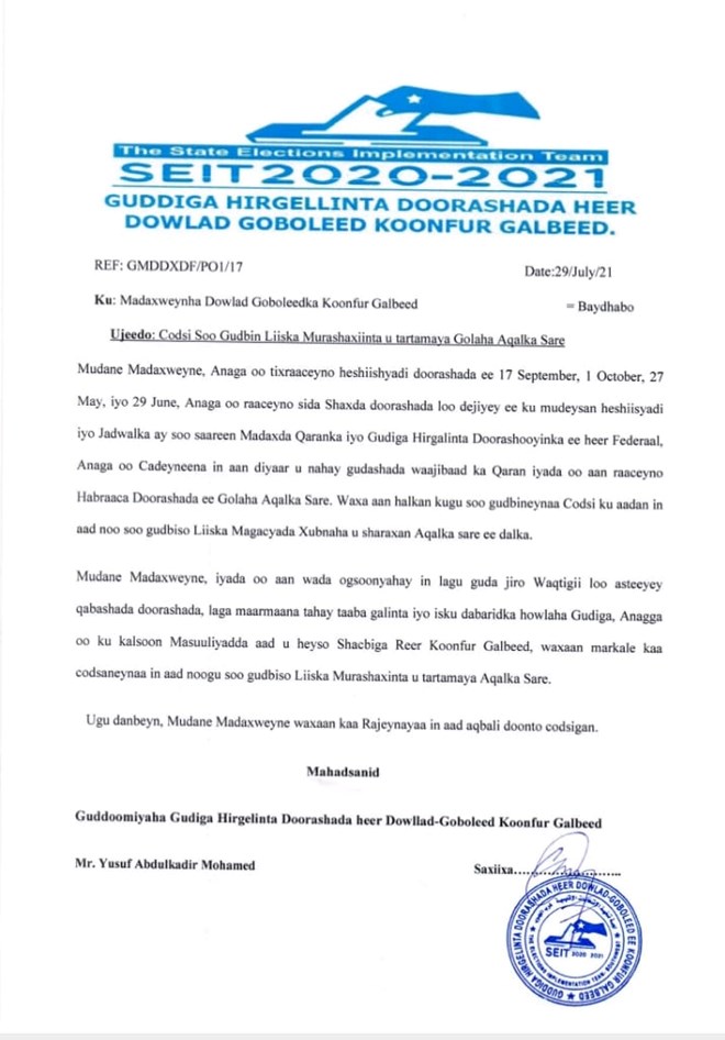 Jimco, Luulyo, 30, 2021 (HOL) - Guddiga doorashooyinka maamulka Koofur Galbeed ayaa codsi u gudbiyay madaxweynaha maamul goboleedka Koofur Galbeed Cabdicasiis Maxamed Laftagareen.
