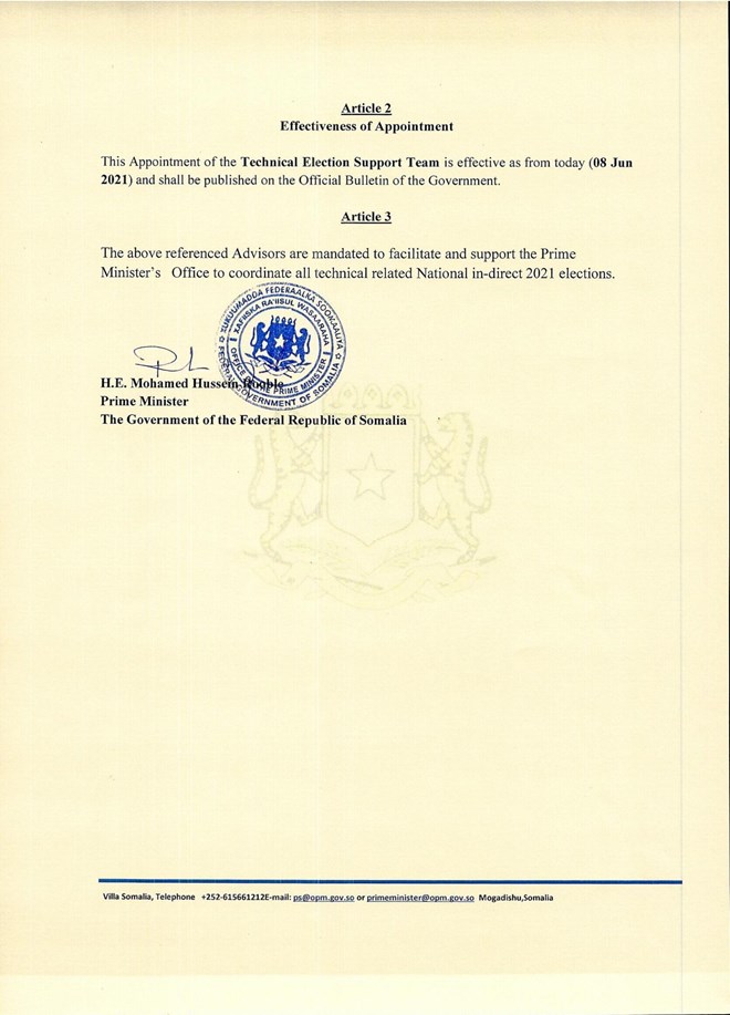 Arbaco, Juun, 9, 2021 (HOL) - Raysal wasaaraha Soomaaliya Maxamed Xuseen Rooble ayaa magacaabay guddi sare ee farsamo oo u qaabilsan hirgelinta arrimaha doorashooyinka dalka.