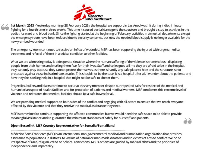 Khamiis, March, 2, 2023 (HOL) - Ururka Dhakhaatiirta aan xuduuda lahayn ee MSF, ayaa sheegay in madaafiic ku dhacday isbitaalka Laascaanood awgeed, anay shaqaynayn qaybihii caruurta iyo kaydkii dhiiga.